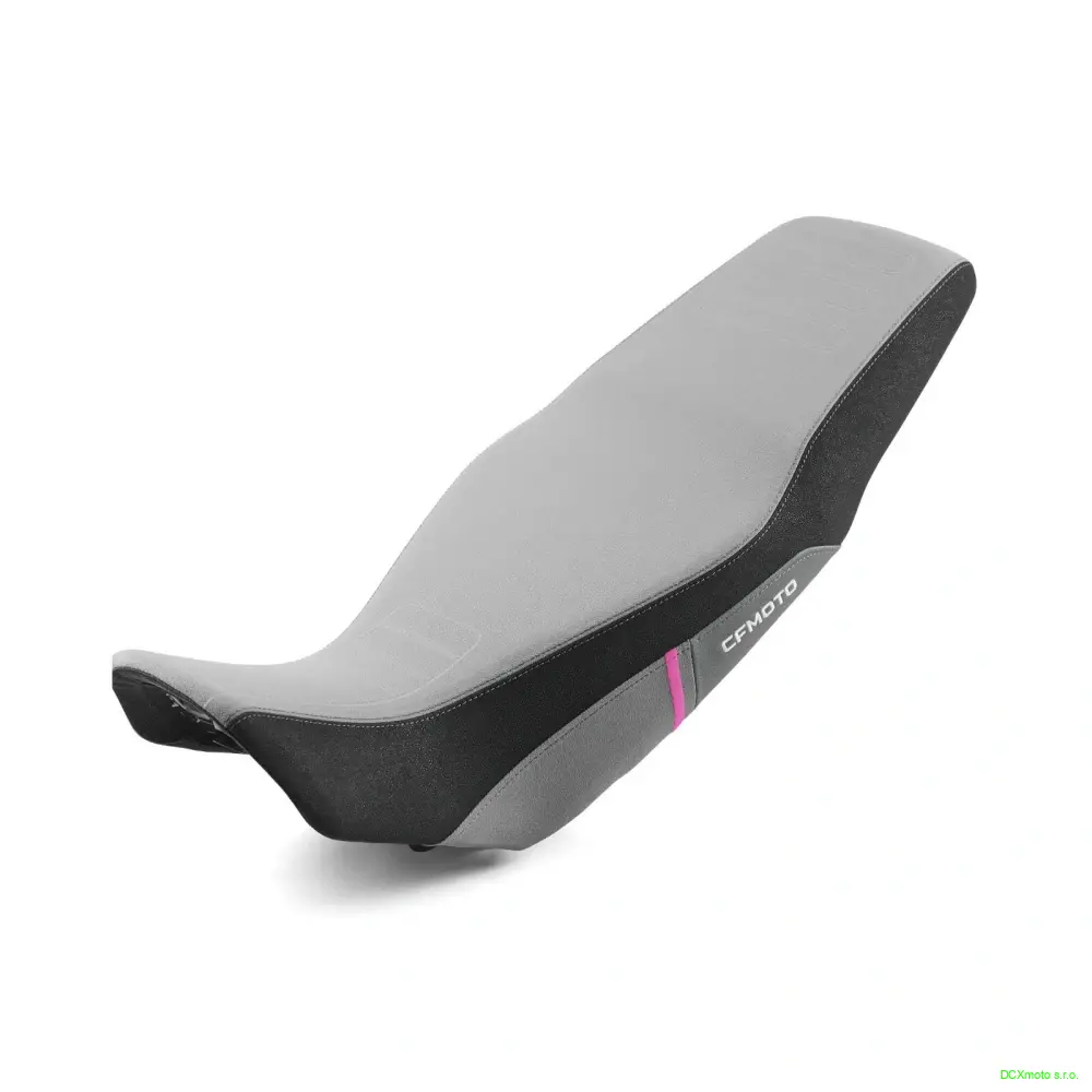 O 50 mm zvýšené sedlo pro motocykl CFMOTO 450MT z řady originálního příslušenství. Celková výška posezu jezdce dosahuje 870 mm. Verze s růžovým proužkem perfektně ladí s modrým provedením 450MT.